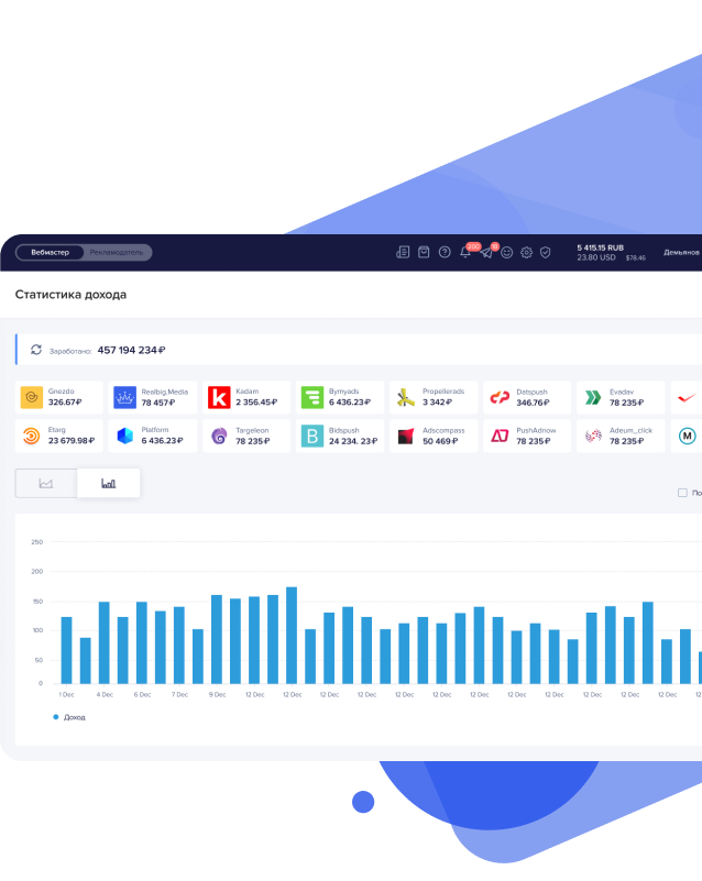 Forget about Excel and heaps of different ad network accounts, it’s worth adding yours site once in RealBig.media, and at any moment you can see all the statistics for all your sites in your office, on a convenient dashboard.
